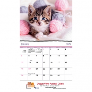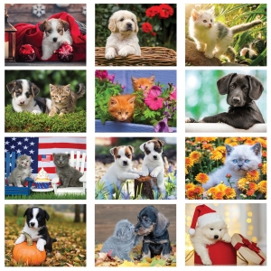 Features thirteen images of adorable puppies and kittens. You're sure to be smiling at them as they are caught in their daily antics. 13-month, 4-color wall appointment calendar. Measuring 10 3/4″ W x 19″ H Closed 10.75″ W x 10.50″ H. Perfect for pet adoption centers, pet stores, veterinarian offices and other animal-centric businesses. It is made from 60 lb. paper stock with gloss text and a gloss-coated cover.